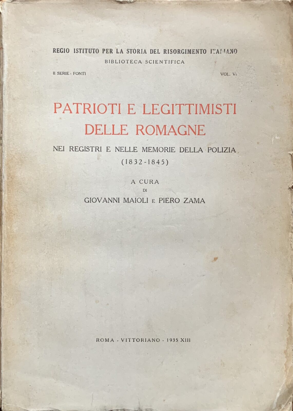 A cura di Giovanni Maioli e Piero Zama. Patrioti e legittimisti delle Romagna nei registri e nelle memorie della polizia (1832-1845). Collana Biblioteca Scientifica del Regio Istituto per la Storia del Risorgimento Italiano n° 6. Vittoriano Roma, 1935. Brossura. Pagine 214. Dimensioni cm. 18,5 x 25,5. 1^ edizione. Con 1 illustrazione in b/n fuori testo. Dedica con autografo dell’autore (Maioli) all’interno. Qualche fioritura, per il resto esemplare in buone condizioni.