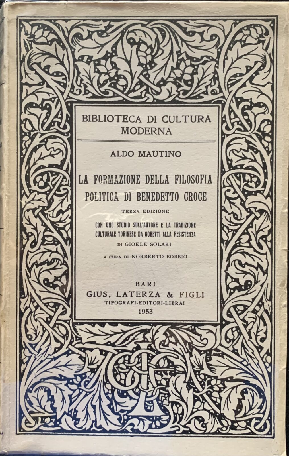 Aldo Mautino. La formazione della filosofia politica di Benedetto Croce. Con uno studio sull’autore e la tradizione culturale torinese da Gioberti alla Resistenza di Gioele Solari. Collana Biblioteca di Cultura Moderna n° 503. Laterza Bari, 1953. Brossura illustrata. Pagine 286. Dimensioni cm. 13,5 x 20,5. 3^ edizione. A cura di Norberto Bobbio. Esemplare in buonissime condizioni.