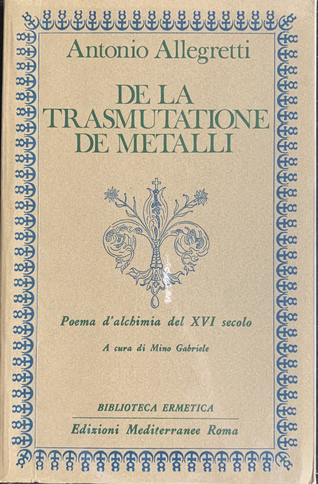 Antonio Allegretti De la trasmutazione de metalli. Poema d’alchimia del XVI secolo. Collana Biblioteca Ermetica n° 7. Edizioni Mediterranee Roma, 1981. Brossura illustrata con alette. Pagine 94. Dimensioni cm. 14,5 x 22,5. 1^ edizione. A cura di Mino Gabriele – Con alcune illustrazioni in b/n. Esemplare in ottime condizioni.