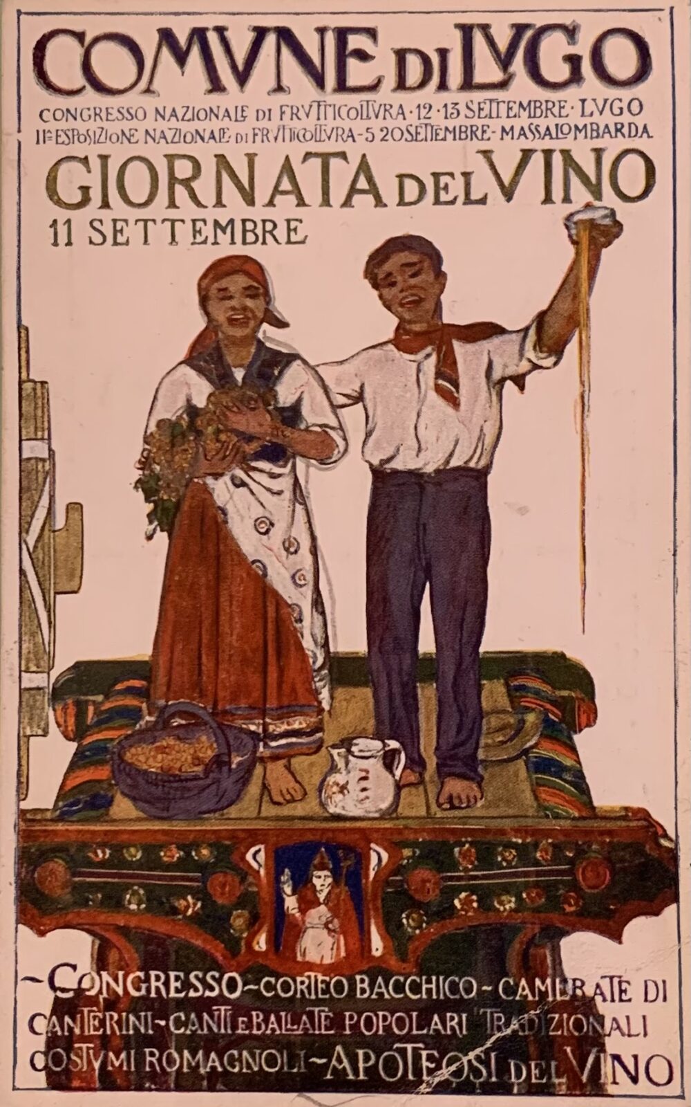 Cartolina originale. Congresso Nazionale di Frutticoltura Lugo, Giornata del Vino. Illustratore Adolfo De Carolis (Montefiore dell’Aso 1874 – Roma 1928). Formato piccolo. Databile nel 1927. Dimensioni cm 14,5 x 9. Non viaggiata. Piega all’angolo inferiore dx e leggere abrasioni sul retro, per il resto esemplare in buone condizioni.