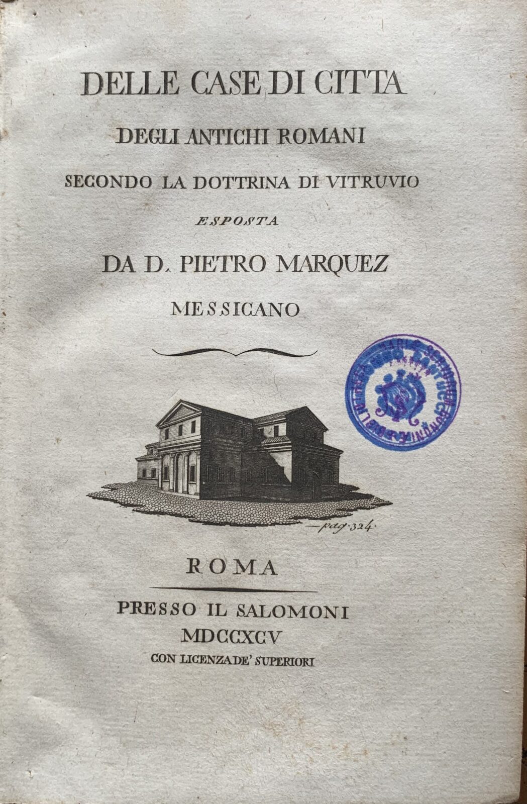 D. Pietro Marquez Messicano. Delle case di città degli antichi Romani secondo la dottrina di Vitruvio. Presso Il Salomoni Roma, 1795. Mezza pergamena. Pagine XXXIX+386+VI. Dimensioni cm. 15 x 22. 1^ edizione. Con 6 tavole ripiegate in b/n fuori testo. Timbri di possesso all’interno, per il resto esemplare in buonissime condizioni.