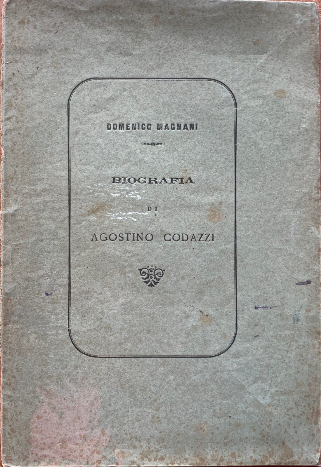 Domenico Magnani. Biografia di Agostino Codazzi. Tipografia del Lavoro Lugo, 1880. Brossura. Pagine 22. Dimensioni cm. 14,5 x 21. 1^ edizione. Con un ritratto di Codazzi in b/n. Qualche fioritura, per il resto esemplare in buone condizioni.
