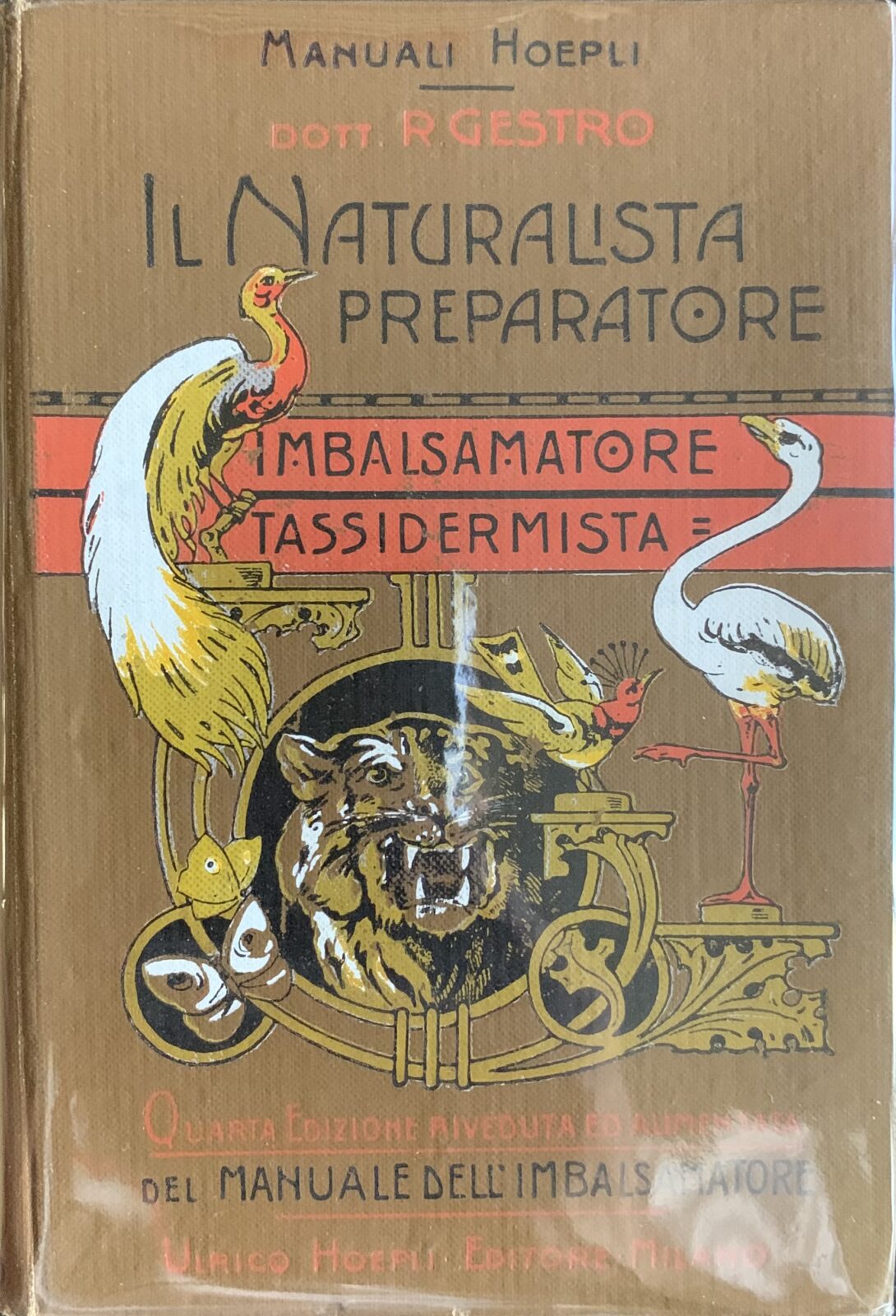 Dott. R. Gestro. Il naturalista preparatore. Imbalsamatore tassidermista. Collana Manuali Hoepli. Hoepli Milano, 1907. Tela illustrata. Pagine 204. Dimensioni cm. 10,5 x 15,5. 4^ edizione riveduta ed aumentata. Con 51 incisioni in b/n. Esemplare in buonissime condizioni.
