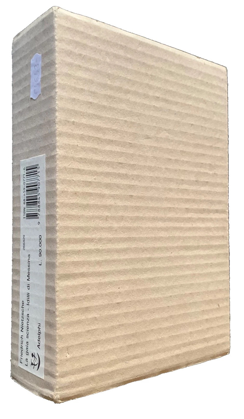 Friedrich Nietzsche. La gaia scienza, Idilli di Messina, Frammenti postumi 1881-1882. Collana Classici n° 11. Adelphi Milano, 1991. Tela con sovraccoperta illustrata, sovraccoperta in acetato ed astuccio in cartoncino. Pagine 680. Dimensioni cm 13,5 x 20,5. 2^ edizione. A cura di Mario Carpitella. Versioni di Ferruccio Masini e Mazzino Montanari. Esemplare in ottime condizioni.