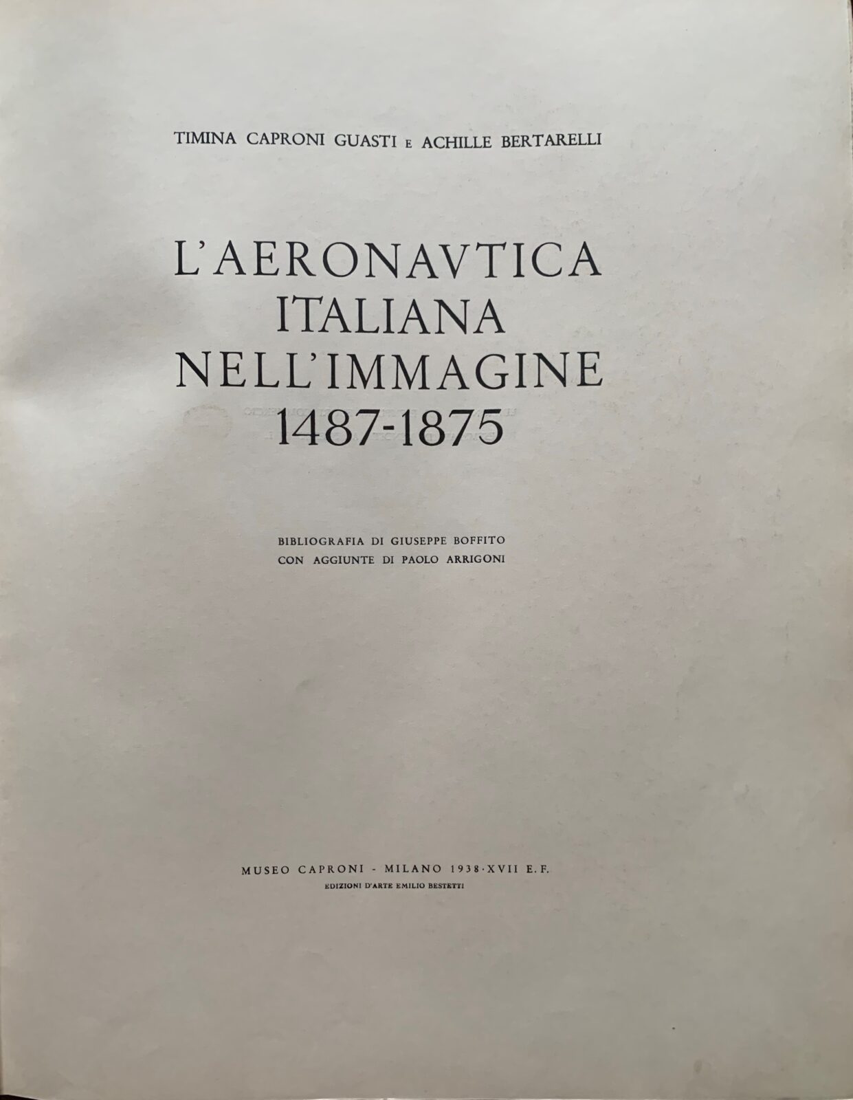 Timina Caproni Guasti e Achille Bertarelli. L’Aeronautica Italiana nell’immagine 1487-1875. Museo Caproni Milano, 1938. Cartonato illustrato. Pagine 186 + tavole. Dimensioni cm. 33,5 x 40,5. 1^ edizione. Con numerose illustrazioni in b/n. Tiratura limitata di 600 esemplari.